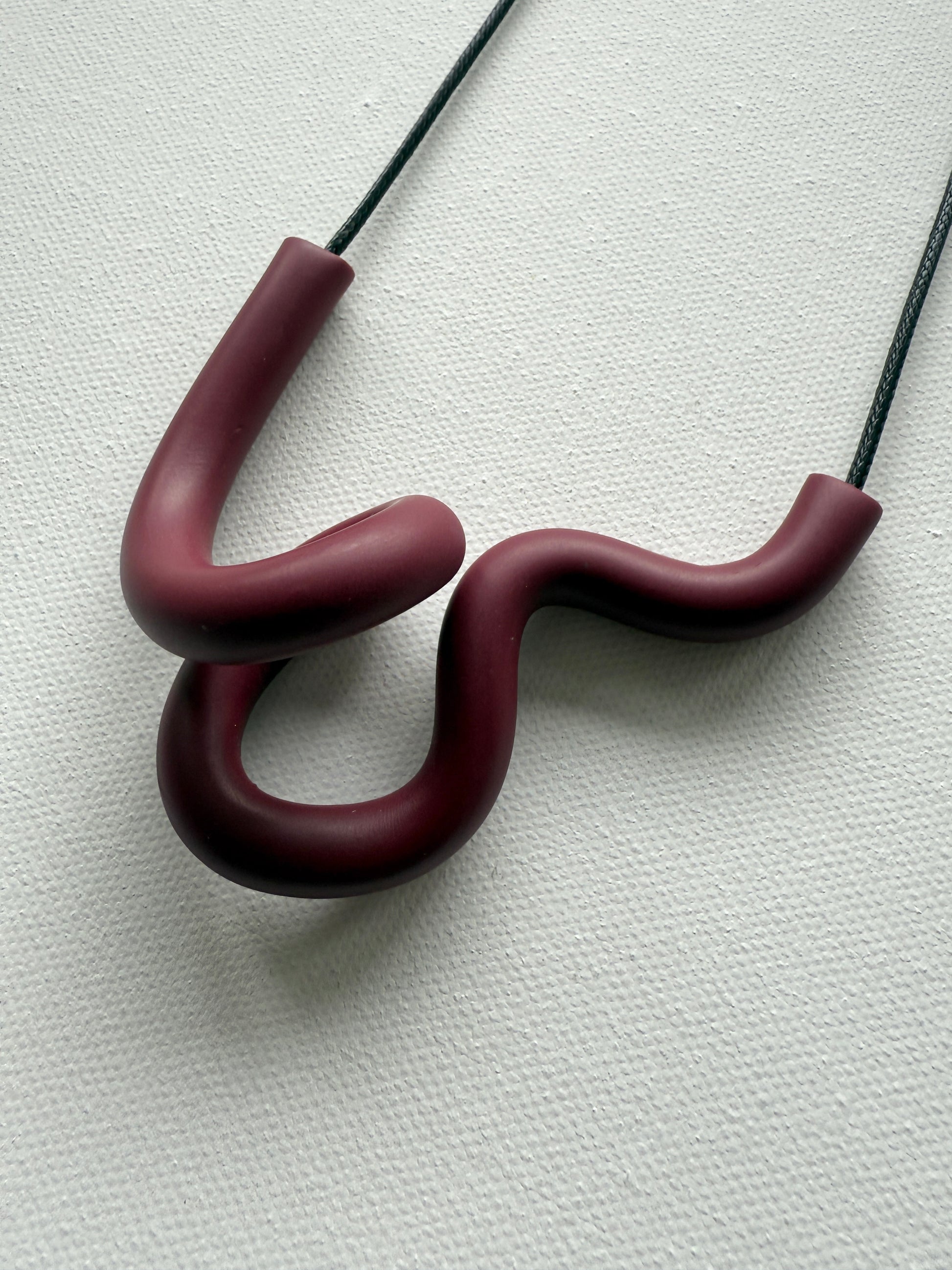 Meet the Ada Necklace ~ a striking piece of wearable art. Handcrafted from high-quality polymer clay, this necklace features a sculptural squiggle design in a beautiful Ox Blood colour, making it the perfect mix of edgy and elegant.