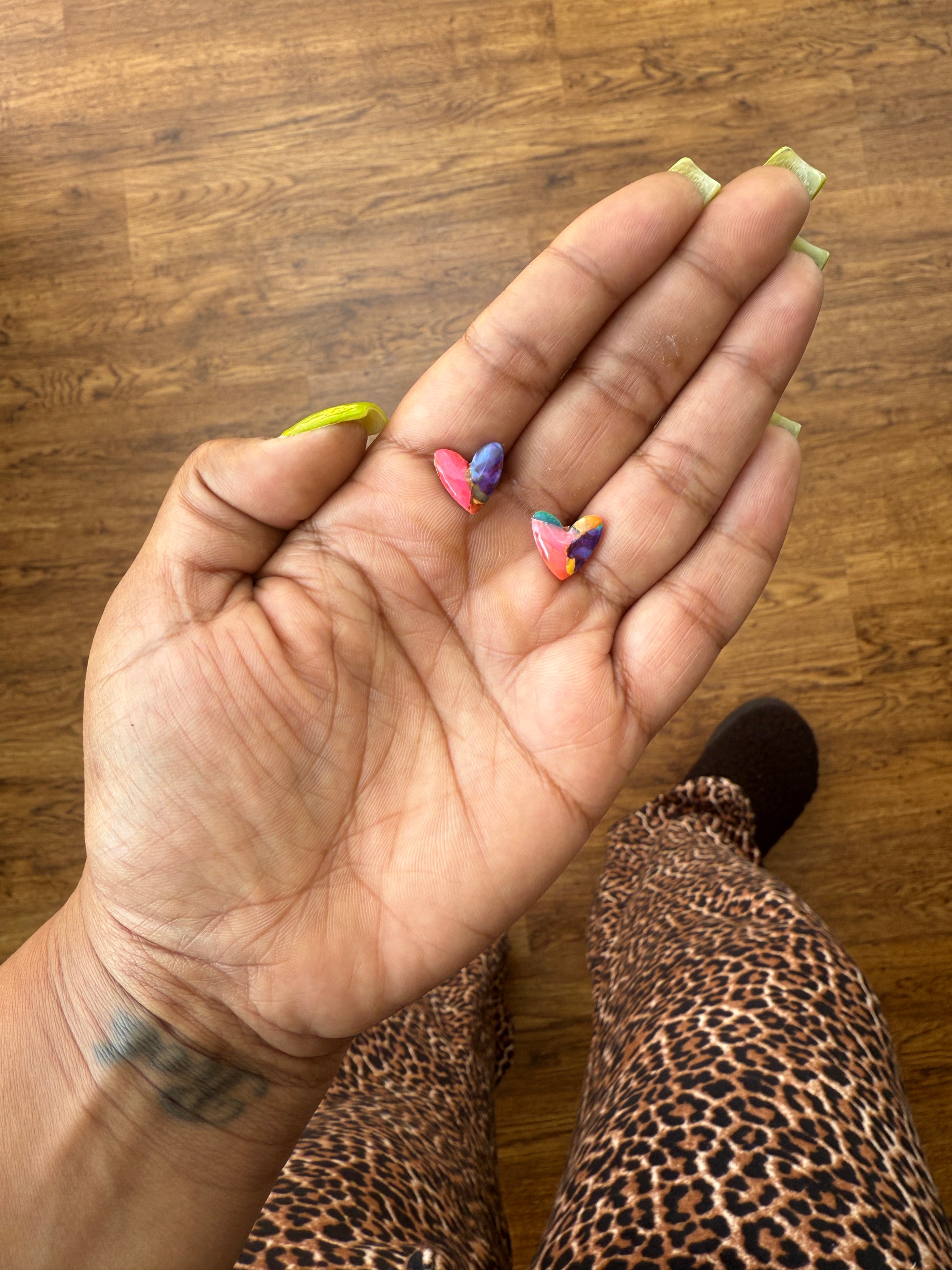 Small in size, bold in sentiment… The LOVE STUD ~ SCRAPPY earrings are a minimalist take on heartfelt style, handcrafted from polymer clay in a beautiful array of colours. These tiny heart studs are designed for everyday wear, offering a sweet statement that pairs perfectly with any outfit.