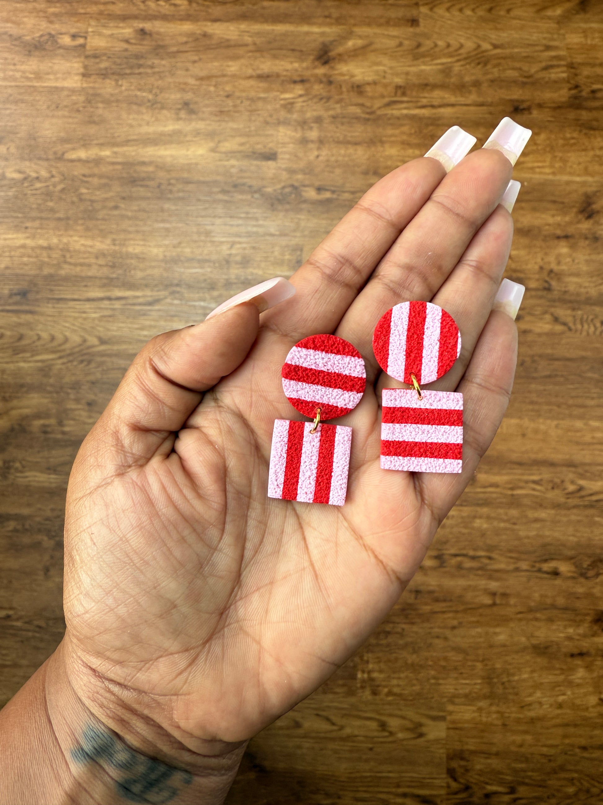 Add a pop of playful charm to your outfit with our RIVA earrings!!! Featuring bold red and pink stripes, these geometric dangle earrings pair a round stud top with a modern square drop for the perfect mix of fun and fashion. Lightweight and comfortable, they’re ideal for all-day wear without sacrificing style.